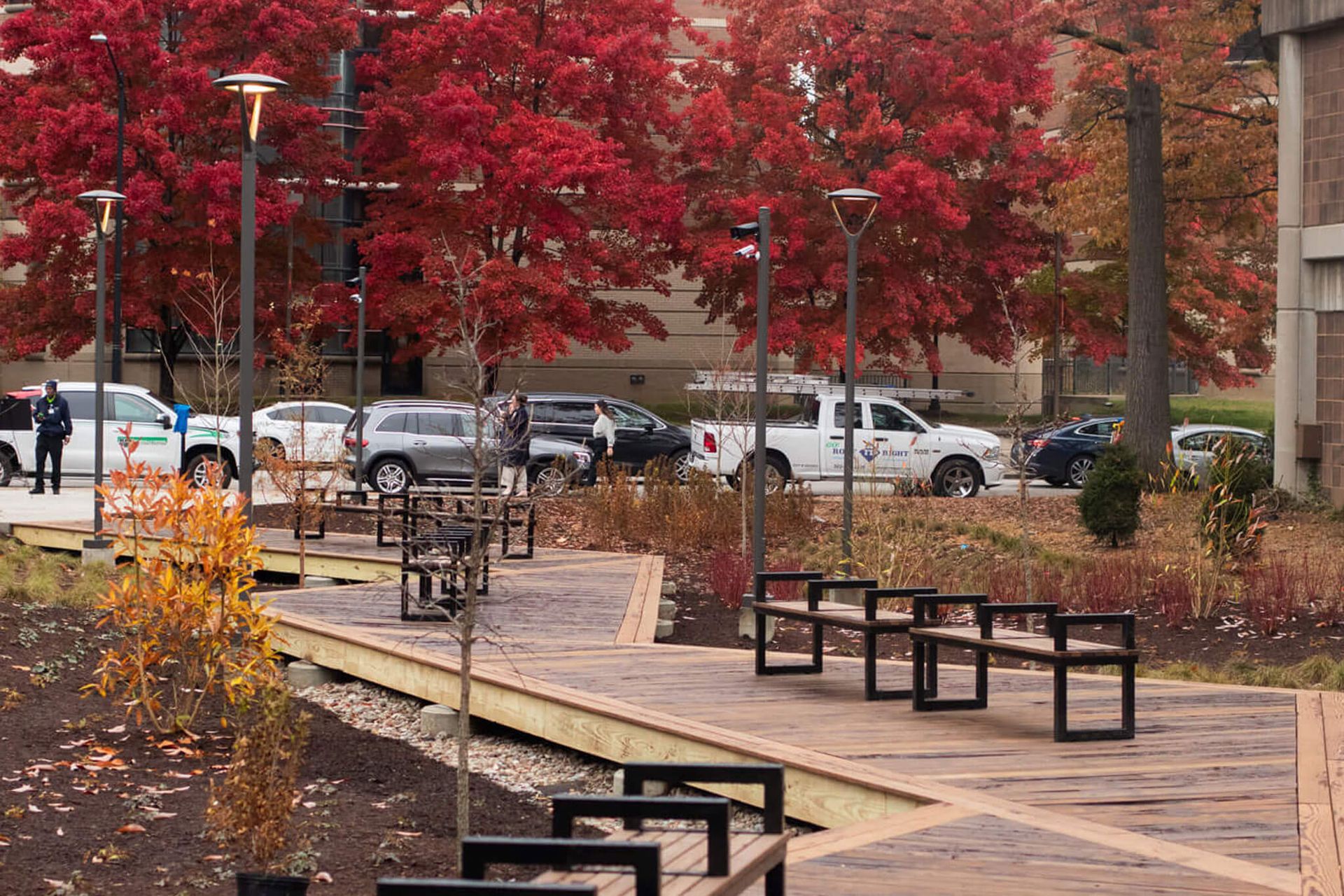 LOUMED Commons features new elements that bring the district to life. Visitors can enjoy a pavilion structure with integrated lighting and resin art panels, a multi use kiosk designed for pop up retail or food and beverage offerings, dedicated areas for food trucks and a series of plaza seating zones surrounded by native plantings. These additions set the tone for community gatherings, outdoor breaks and programing throughout the year.