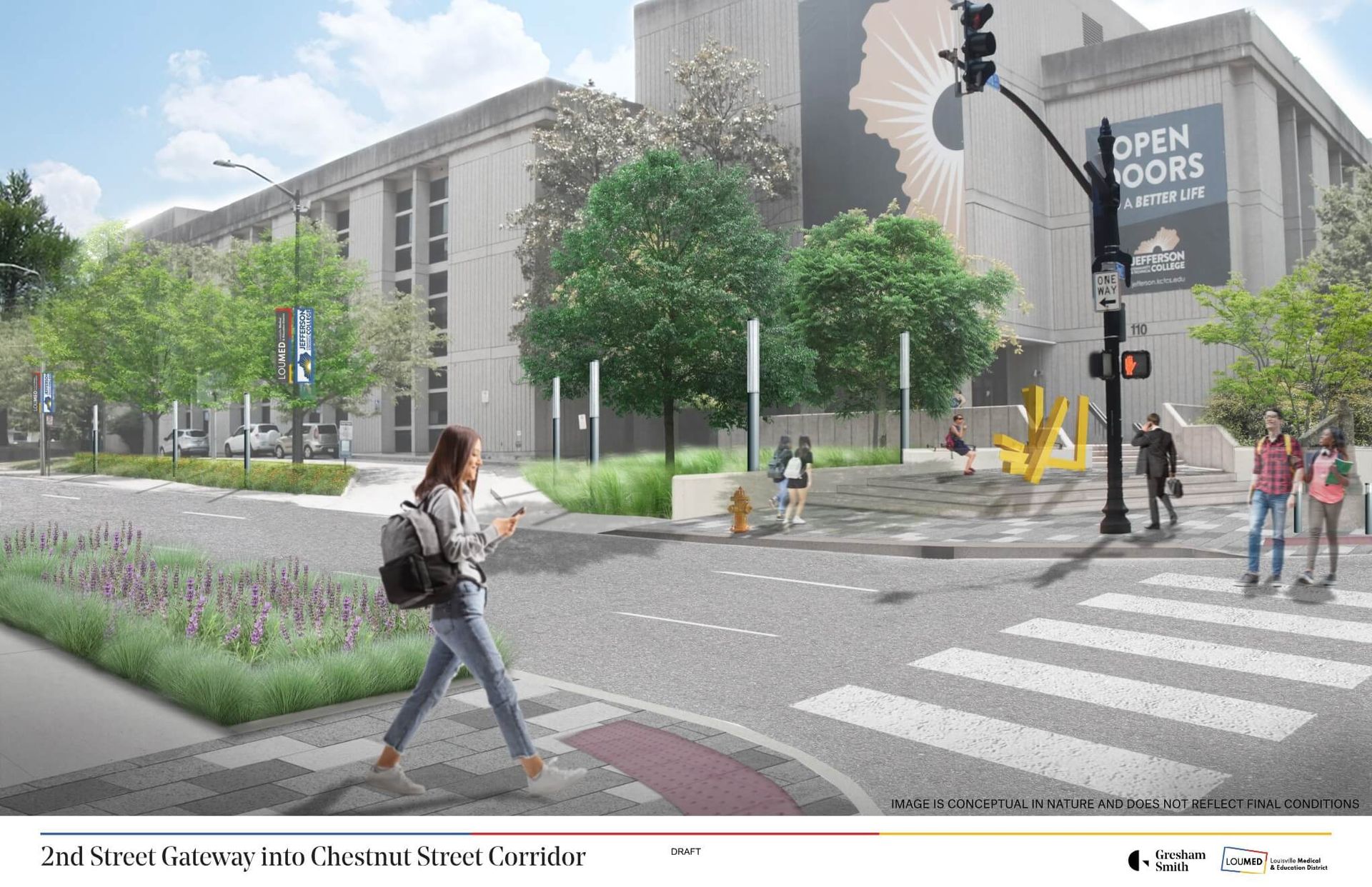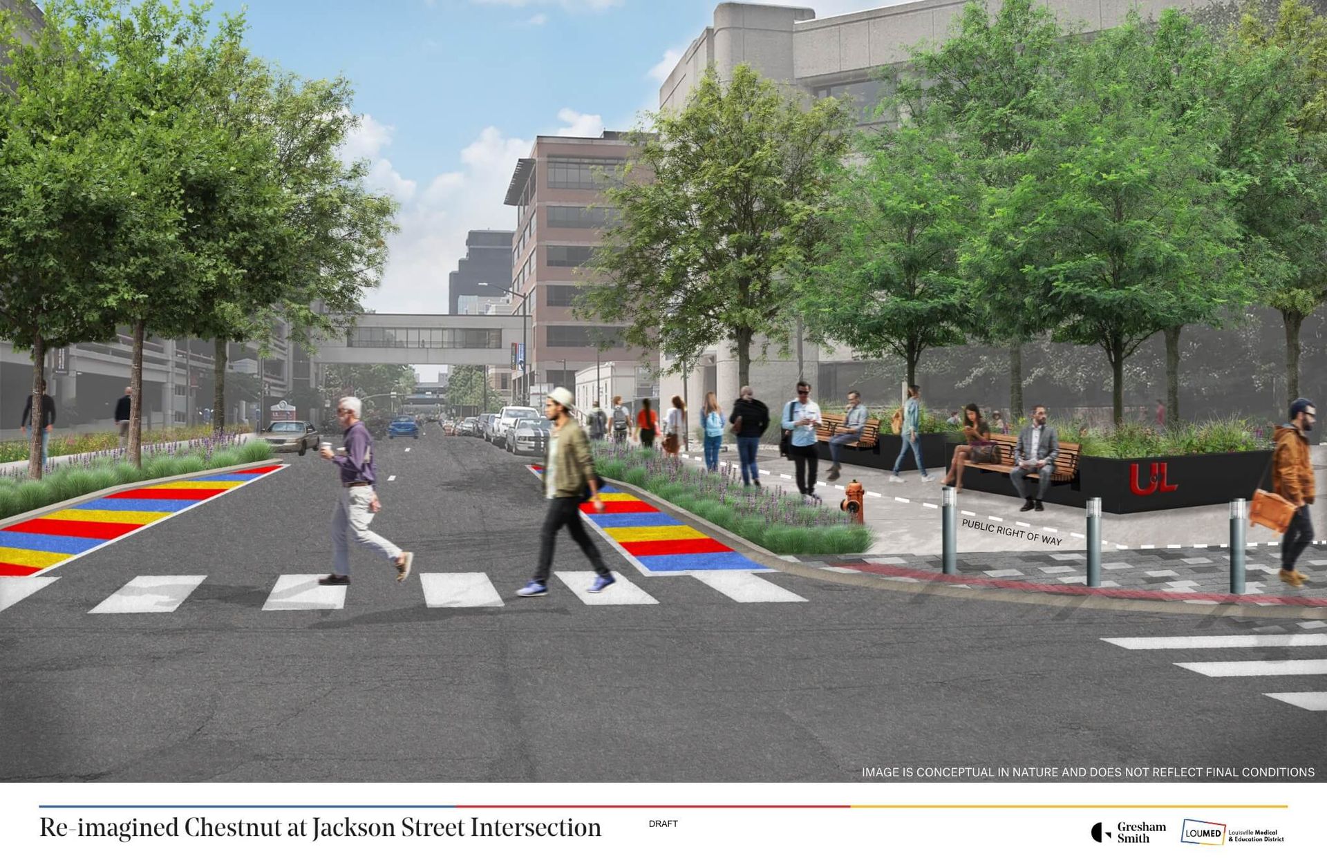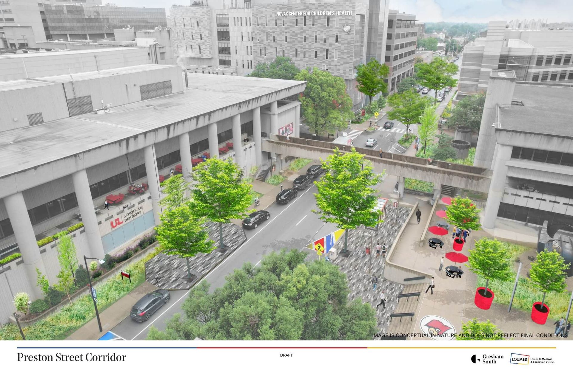 Once complete, Chestnut Street will serve as a greener and more connected corridor that brings together LOUMED’s hospitals, classrooms, research facilities and community spaces into a more seamless district experience.